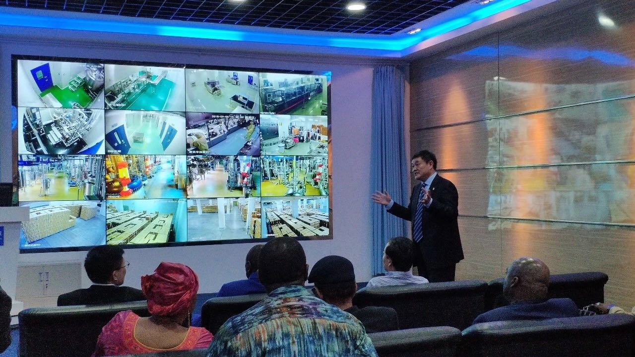 随后,孔戴总统还观看了覆盖厂区各角落、生产全过程的安全监控系统,对全自动生产设备、高科技作业流程表示惊叹。李杰总裁自豪地介绍,公司所有的高精尖设备,都是中国自主研发的,在非洲两个工厂的设备也是“中国智造”。孔戴点头表示赞许,并希望将来能将这些高端的技术、设备和人才引入本国。李杰董事长指着全球战略地图上的几内亚说,希望下次再见总统,这片区域的灯也亮起来了。孔戴发出爽朗的笑声。参观结束后,公司领导与孔戴代表团合影留念。