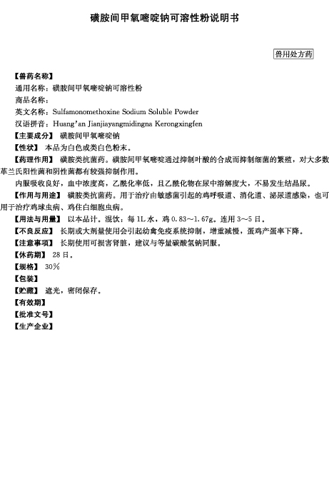 磺胺类抗菌药。用于治疗由敏感菌引起的鸡呼吸道、消化道、尿道感染,也可用于治疗鸡球虫病、鸡住白细胞虫病。